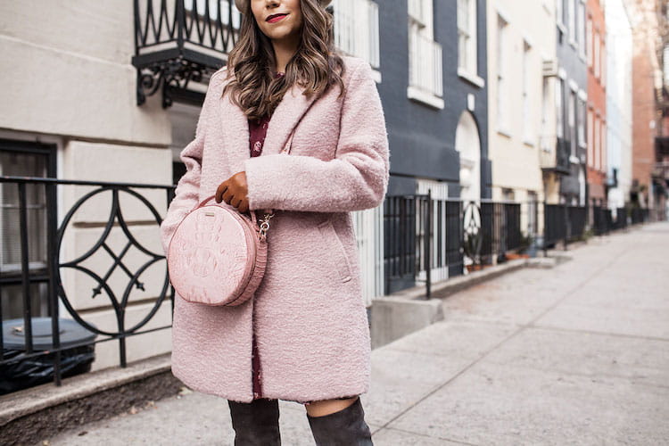 Hallie Friedman of Sleepless In Sequins pairs our large duxbury satchel in macaroon vineyard with a sophisticated white dress. Photo Credit Grant Friedman.
